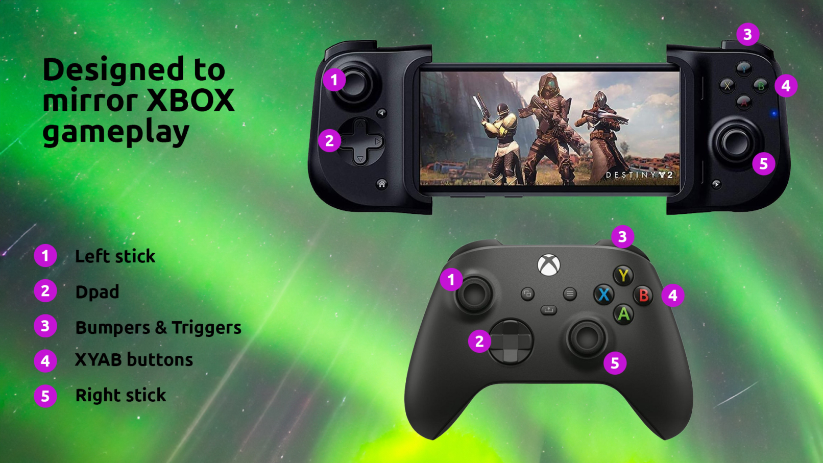 Kishi shown next to XBOX for gameplay control comparison (size not to scale)